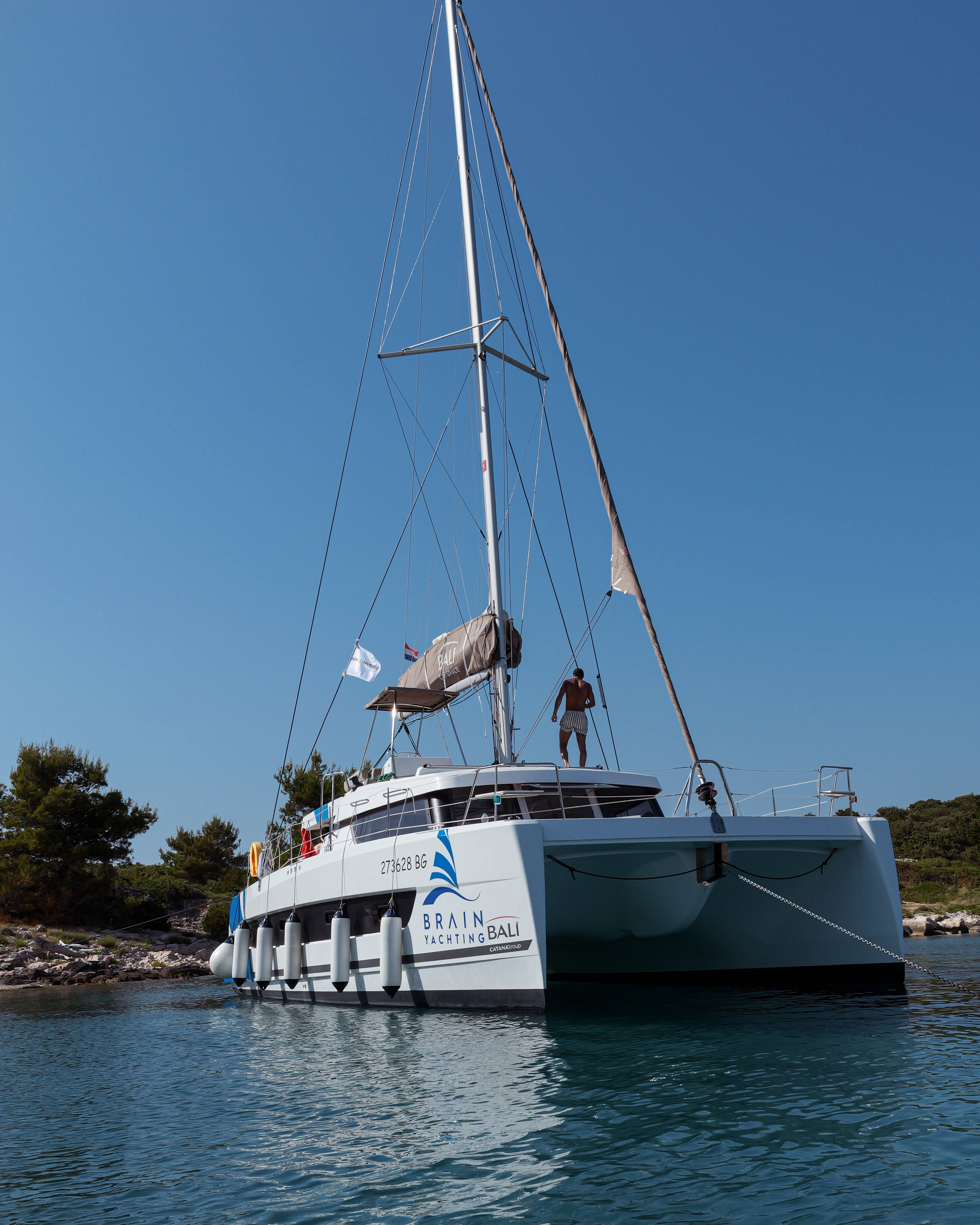 Bali Catspace "My5ive" is equipped with full batten mainsail, self tacking jib genoa type and GPS chart plotter, Autopilot, Hard Top Bimini.