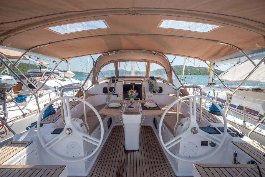 Elan Impression 45 "Vera" est équipé de grand voile semi-lattée grand-voile, enrouleur génois de type et Bimini, Pilote automatique, Capote de descente, Cockpit en teck.