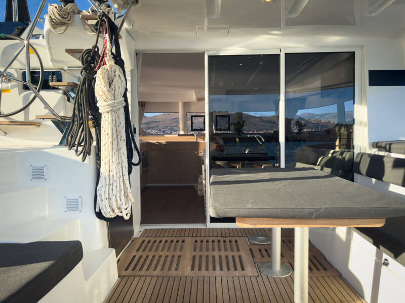 Lagoon 43 "Fox" is uitgerust met Doorgelat Zeil grootzeil, genua type en GPS kaart plotter, Bimini-top, Autopilot, Teak kuip.