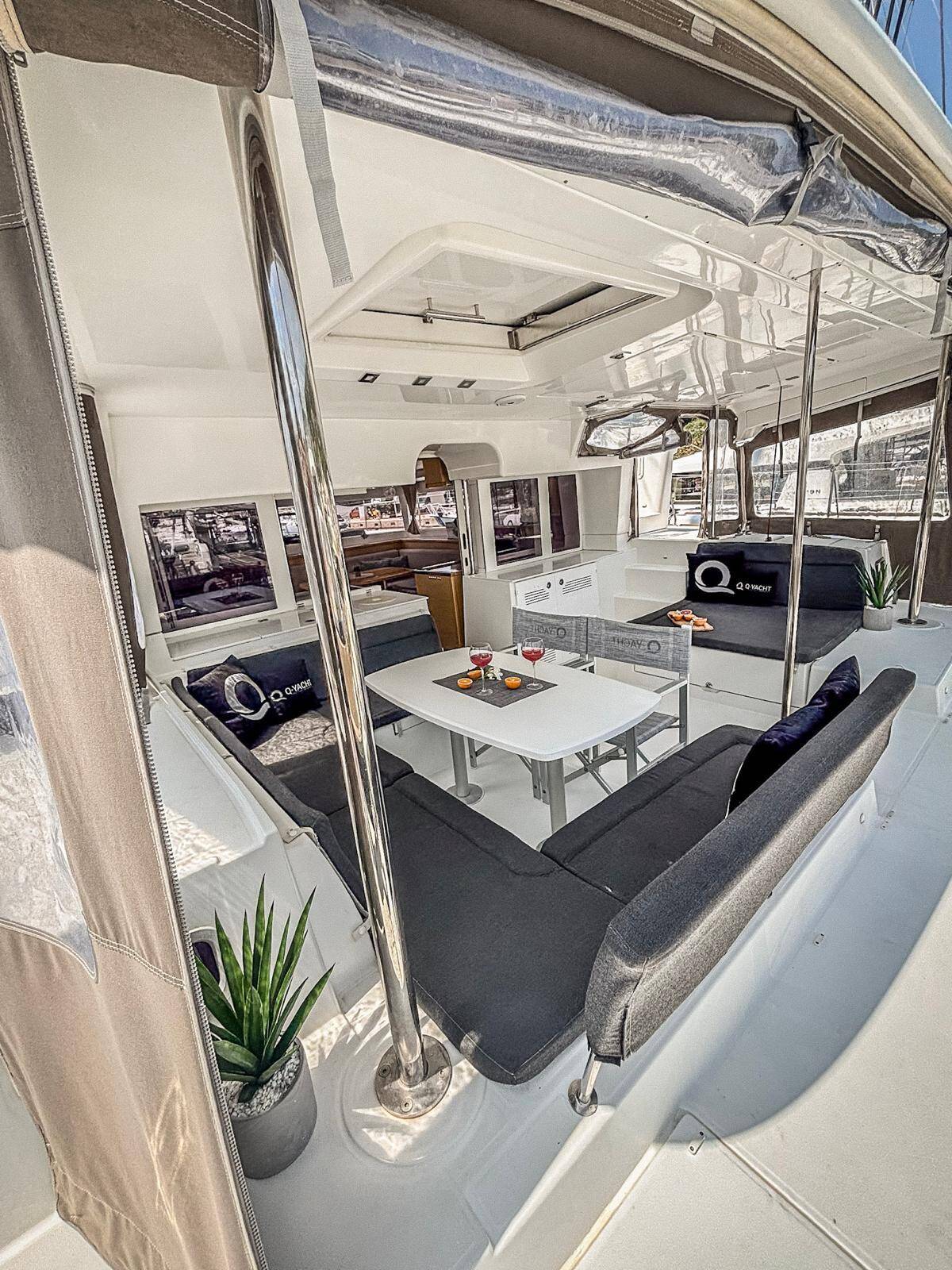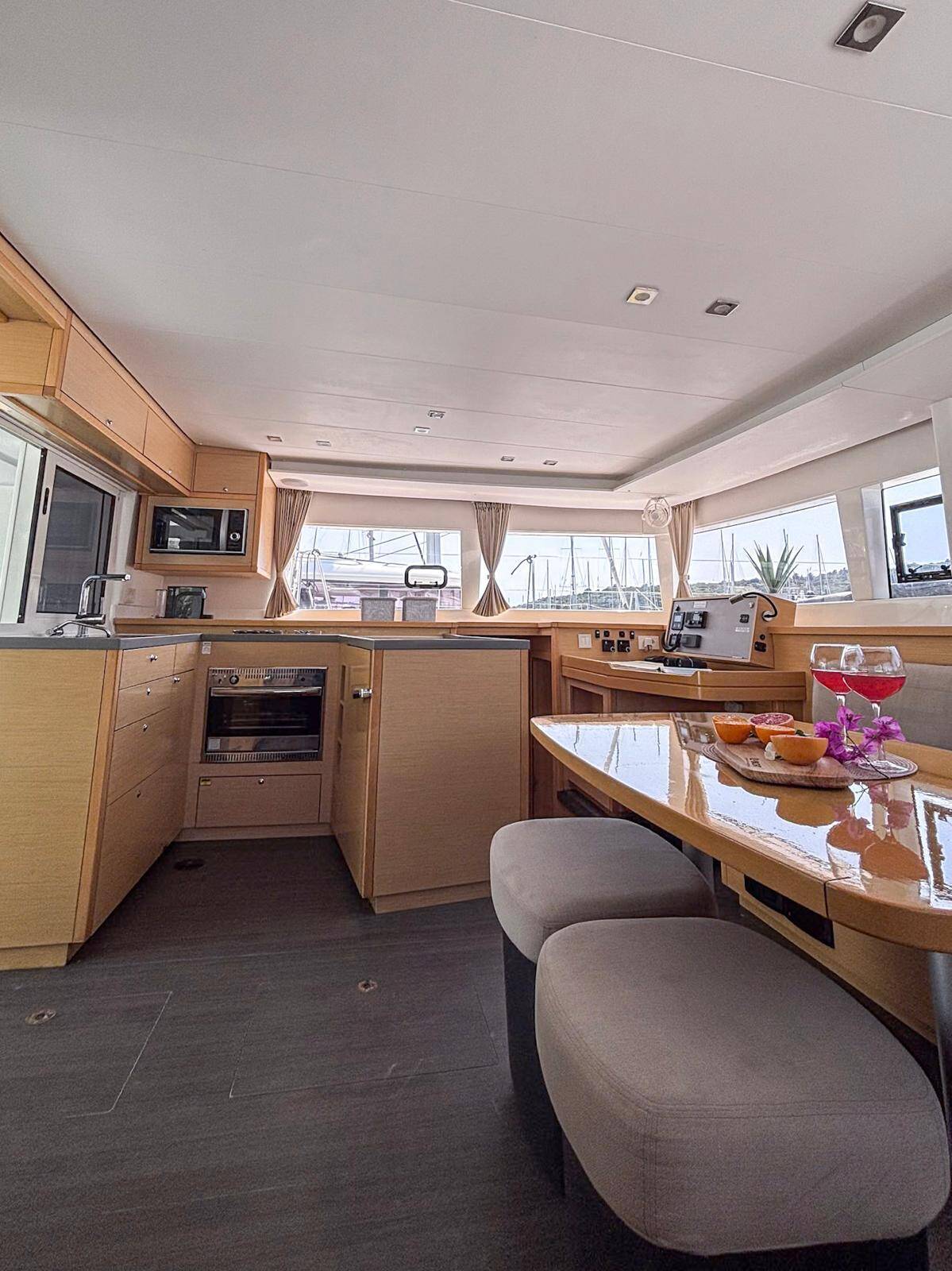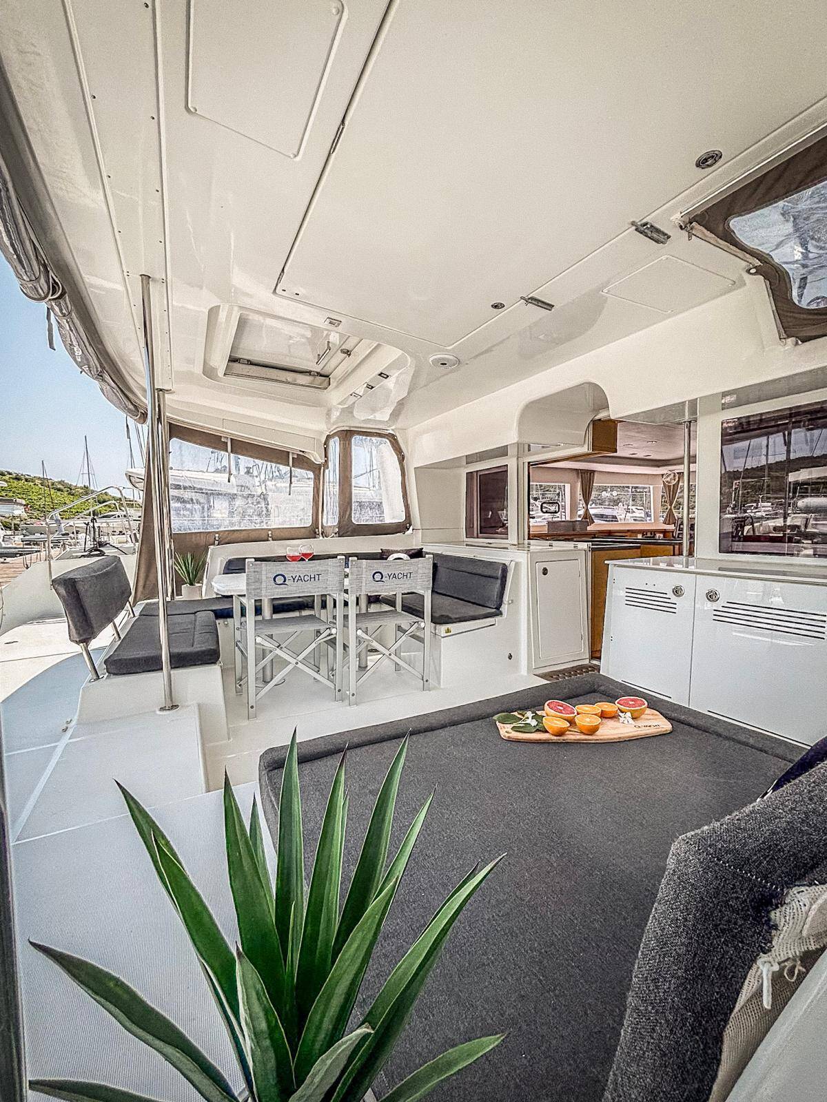 Lagoon 450 F "Red Twin" is uitgerust met Doorgelat Zeil grootzeil, Rolgrootzeil genua type en GPS kaart plotter, Bimini-top, Autopilot.
