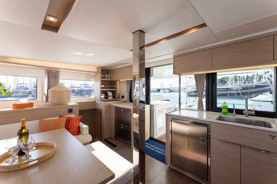 Catamaran Lagoon 46 "Aura" ligt in Marina Frapa, Rogoznica, Kroatië. Gebouwd in het jaar 2025, biedt accommodatie voor 8 + 2 + 2 mensen in 4 + 2 hutten, met 4 toiletten en douche(s).