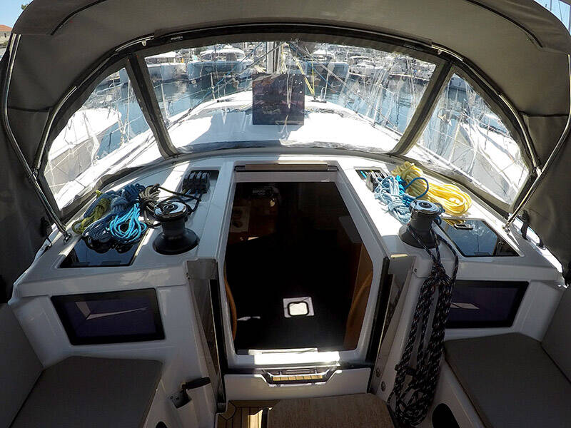 Dufour 44 "Dama" is uitgerust met Doorgelat Zeil grootzeil, Keerfok genua type en Bimini-top, Autopilot, Buiskap.